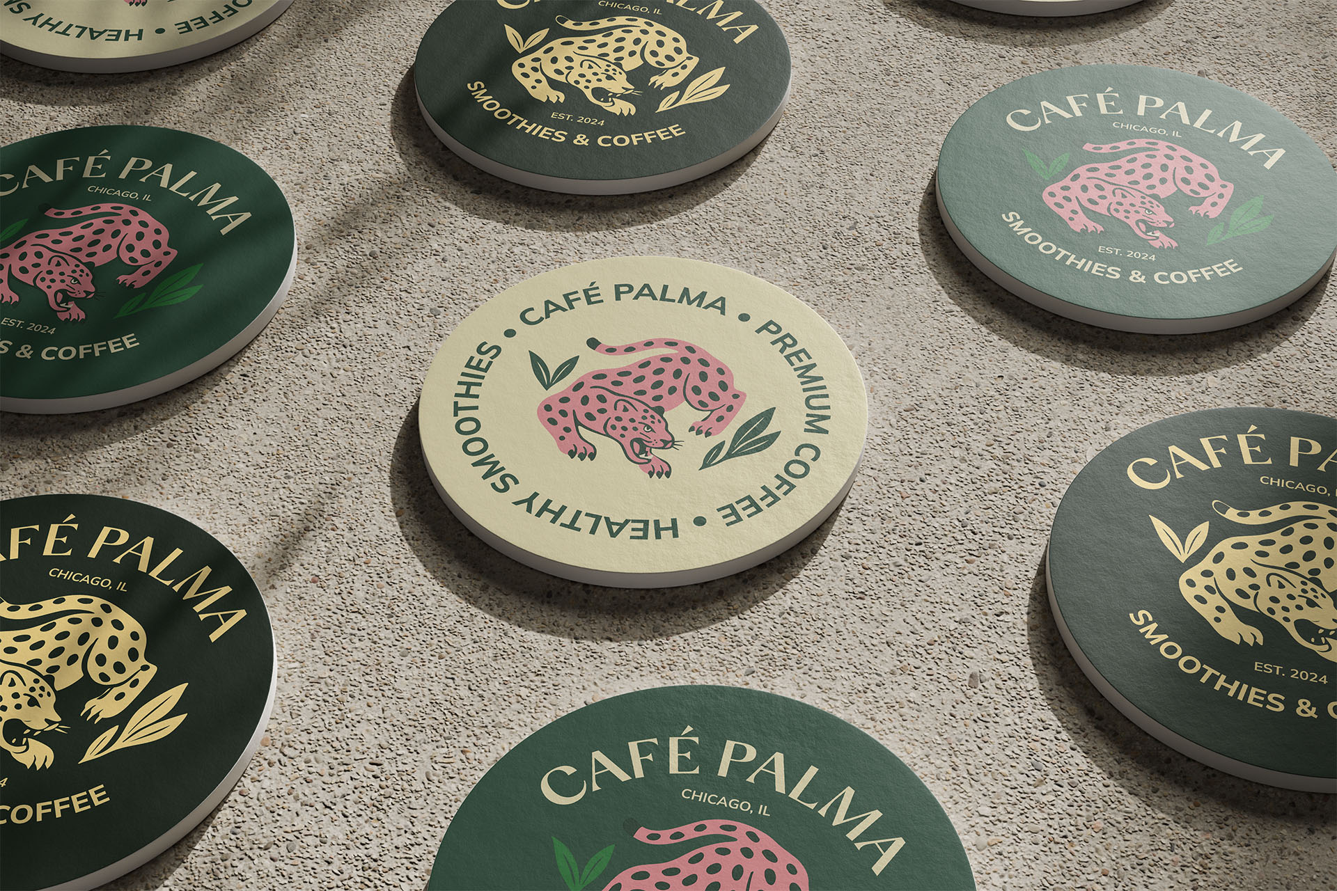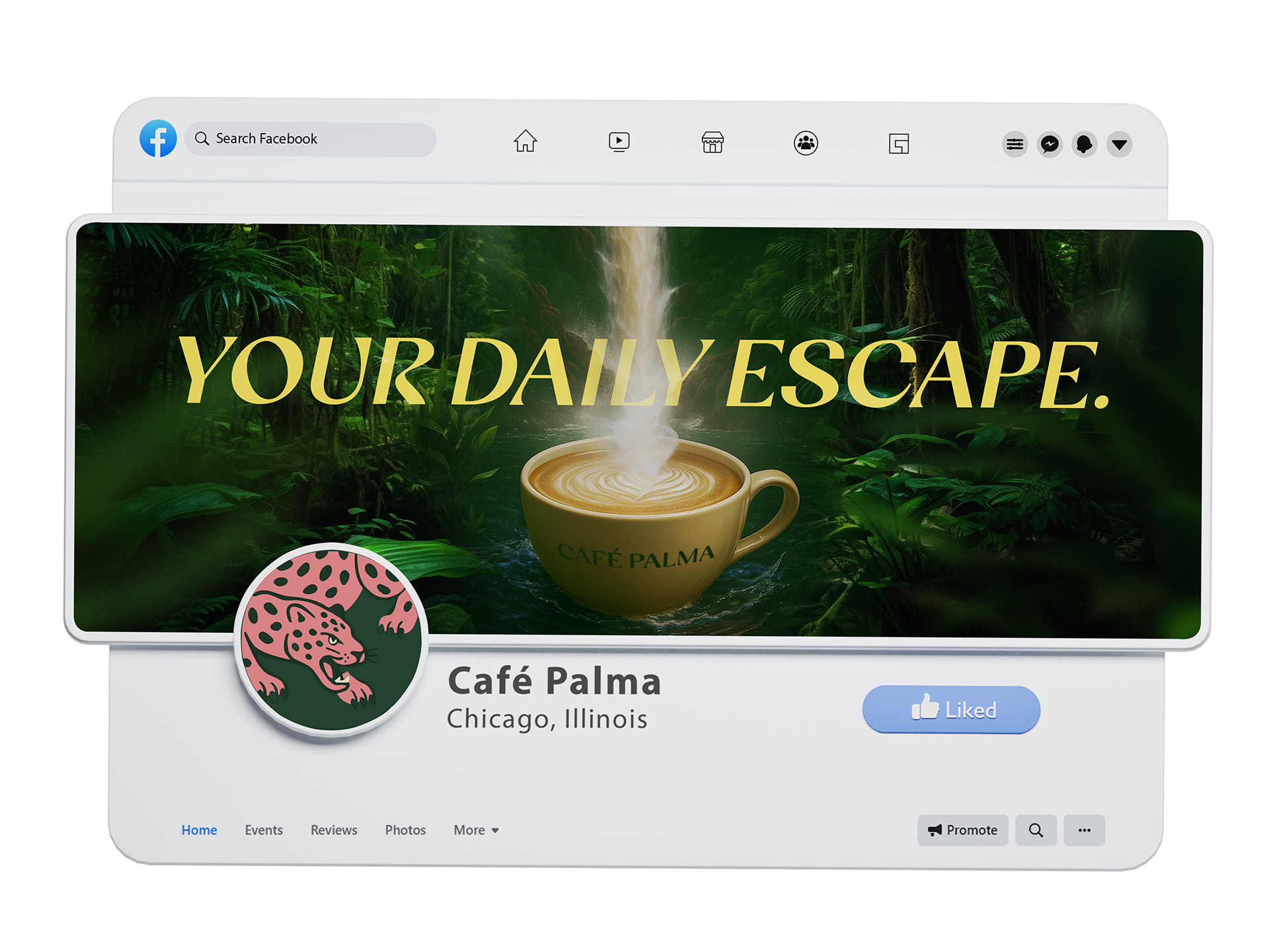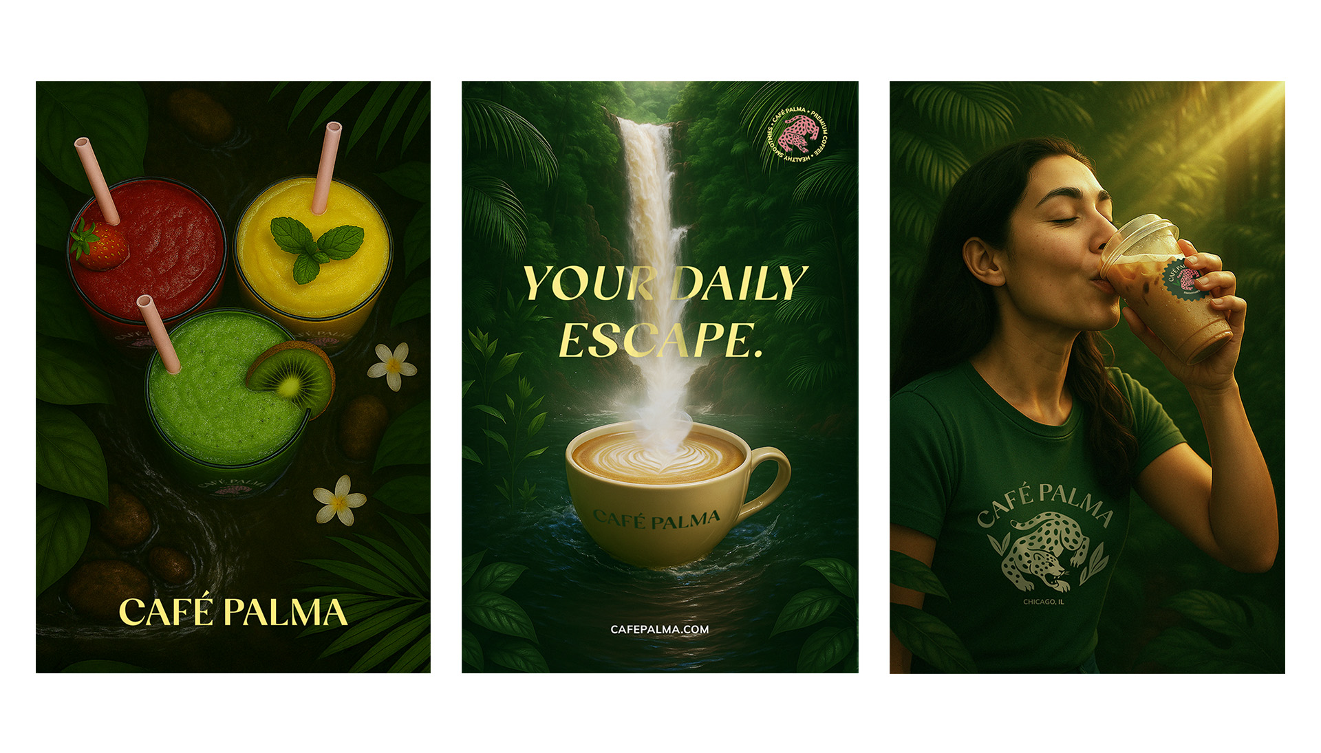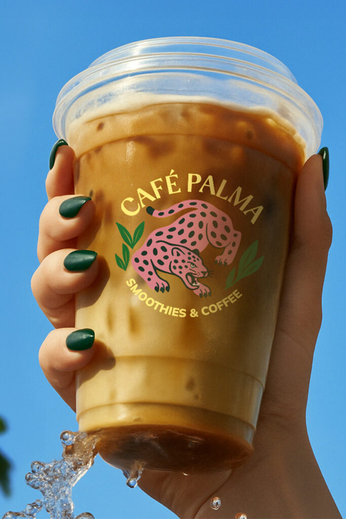 Developed a complete brand identity system built around escape and ritual. Positioned Café Palma as a place people return to, not just pass through. The visual language leaned into tropical elements like, jungle greens, sensory color palette, and a pink jaguar logomark that gave the brand instant recognition. Messaging stayed direct and sensory-focused: what it feels like to take that first sip, not just what’s in the cup.