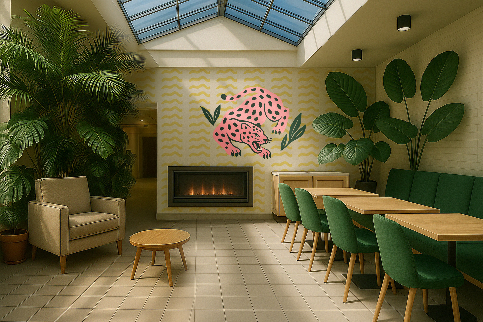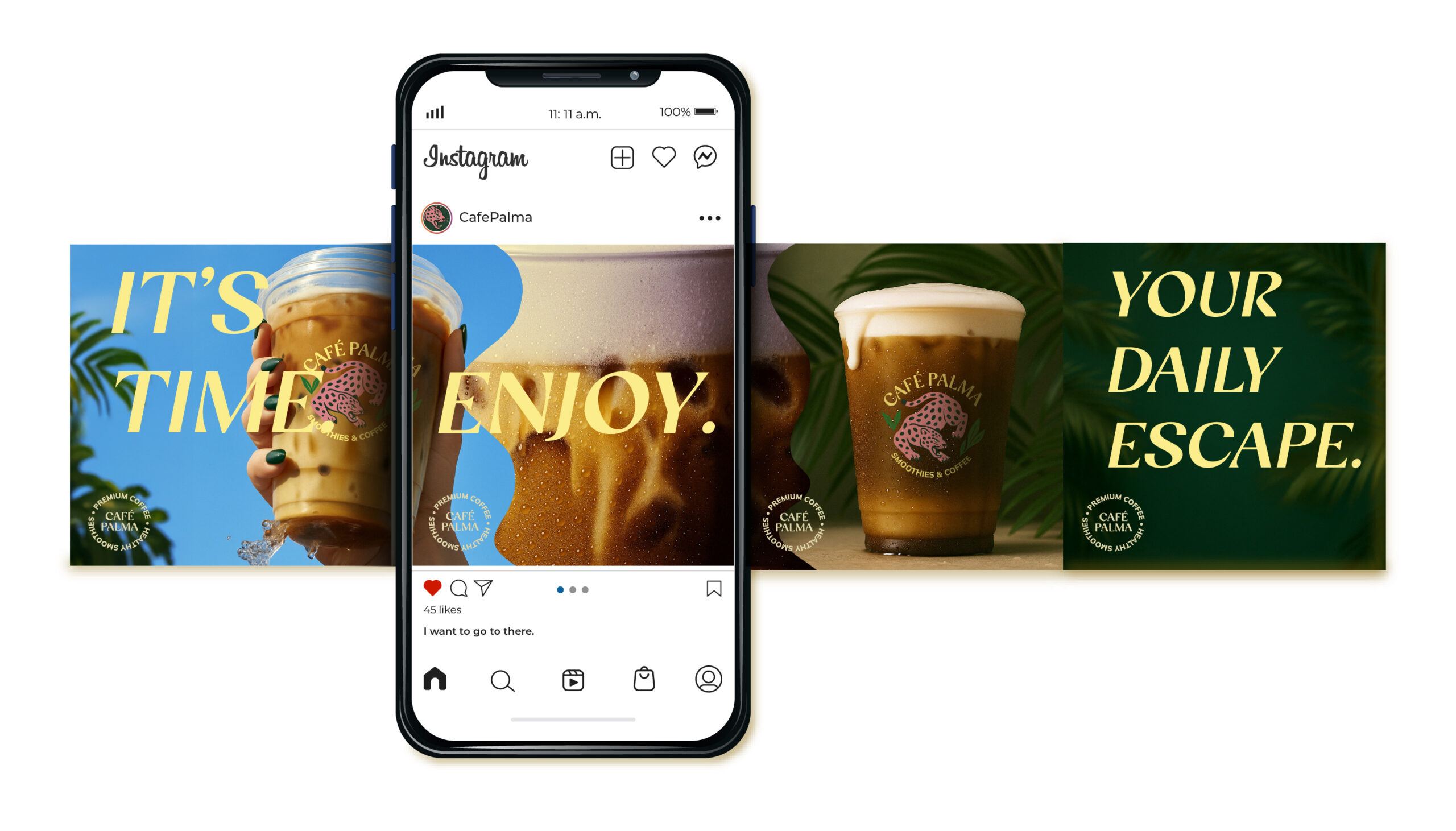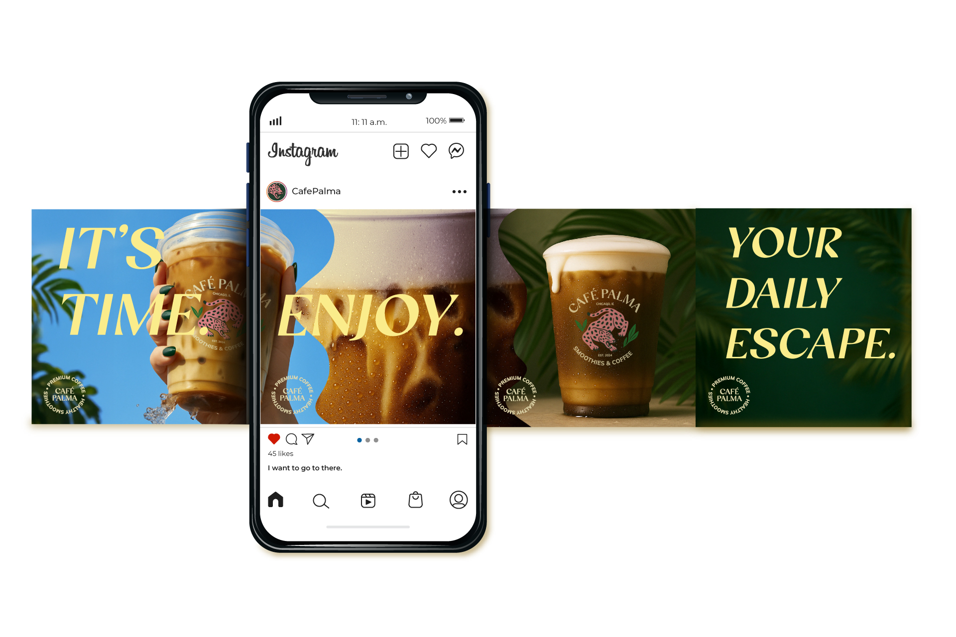 Developed a complete brand identity system built around escape and ritual. Positioned Café Palma as a place people return to, not just pass through. The visual language leaned into tropical elements like, jungle greens, sensory color palette, and a pink jaguar logomark that gave the brand instant recognition. Messaging stayed direct and sensory-focused: what it feels like to take that first sip, not just what’s in the cup.