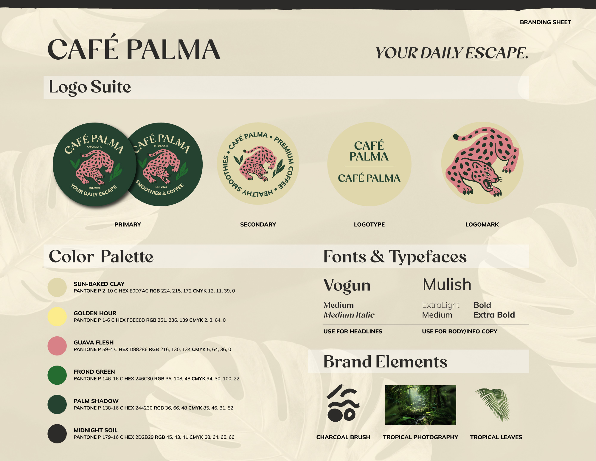 ✔ Brand Identity System: Logo suite (4 variations), 6-color palette, typography hierarchy (Vogun for headlines, Mulish for body), brand photography direction, illustration system including charcoal brush strokes and tropical leaves