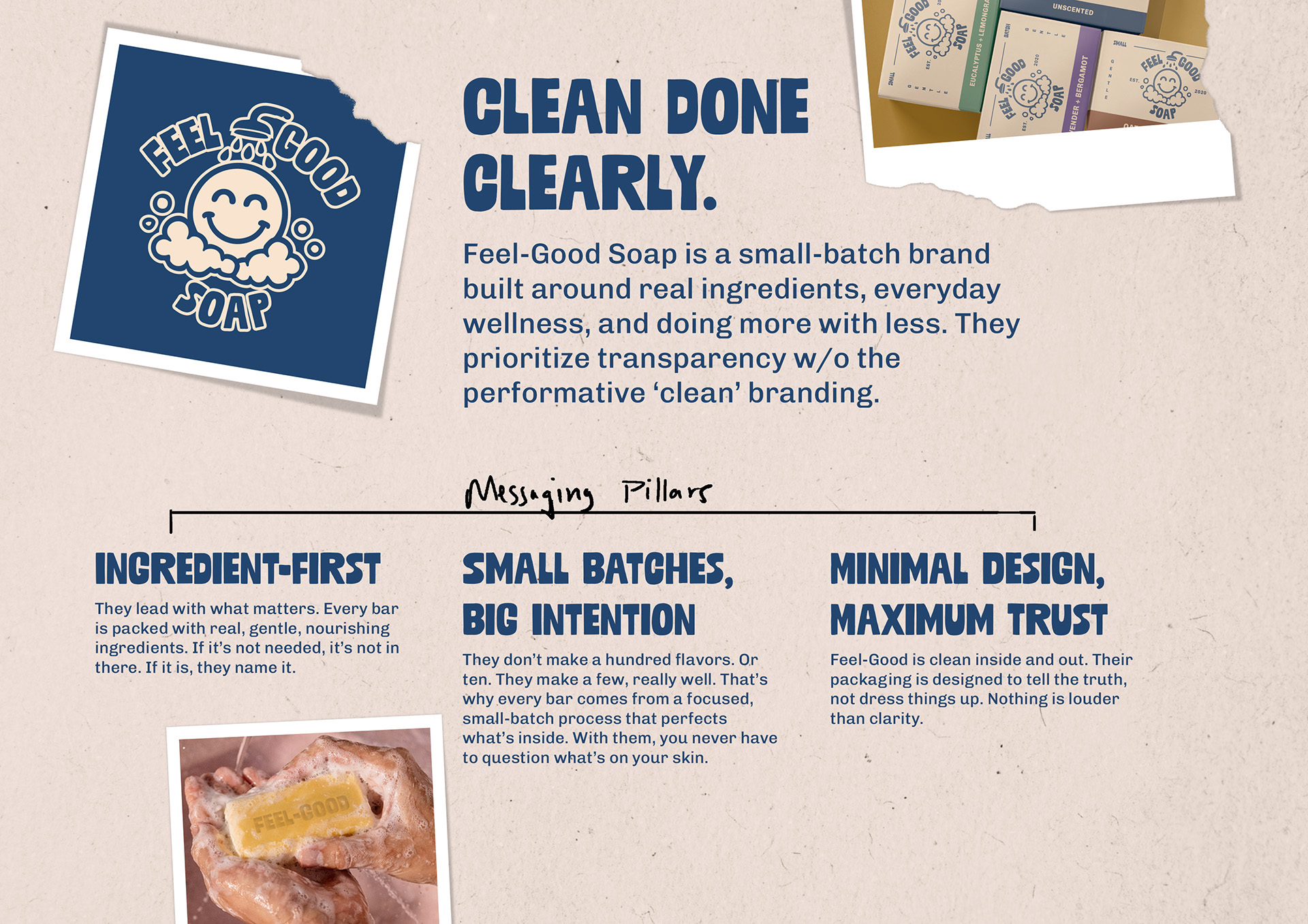 Feel-Good Soap had solid product and growing farmers market following, but no clear brand tying it together. Didn’t need trendy. Needed real. Brand reflecting what they stood for: simple ingredients, small batches, straightforward values, while standing out in crowded skincare space full of jargon and overdesigned packaging. Feel-Good wasn’t just selling soap. They were selling intention and everyday care without performance claims or wellness theater.