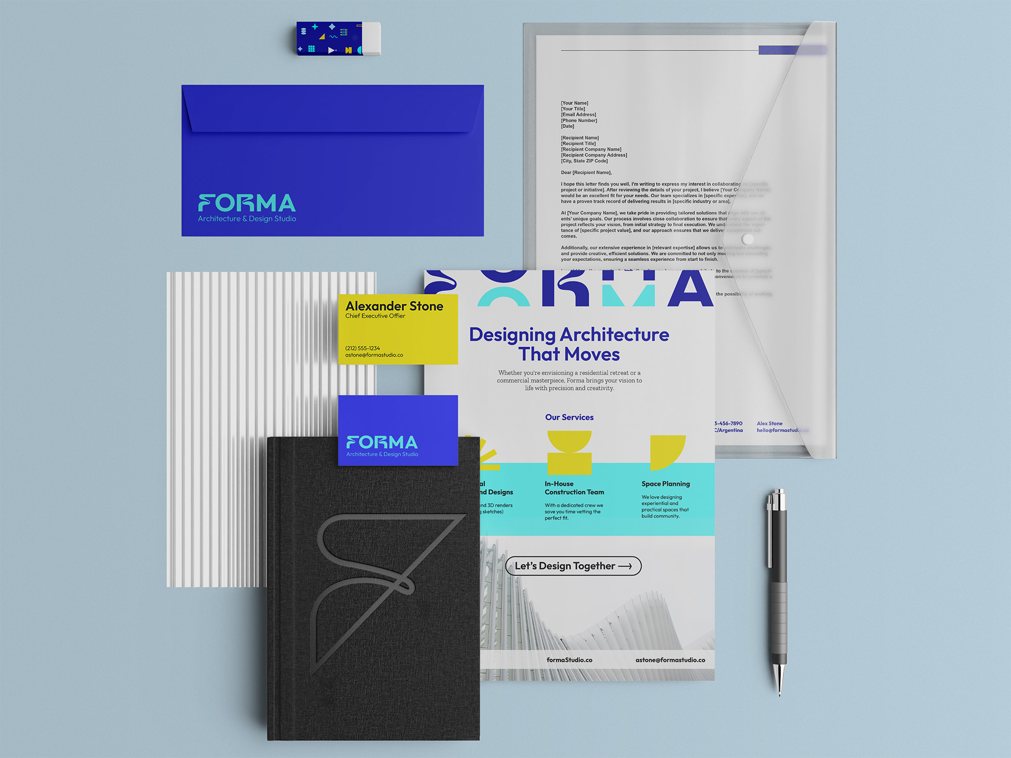 Market Positioning: Rebrand gave Forma credibility and visual presence competing with larger, established firms. Clean, energetic identity system made them instantly recognizable in pitch meetings and industry events, positioning them as both innovative and trustworthy. Differentiated through electric blue + aqua color strategy versus industry-standard grays.