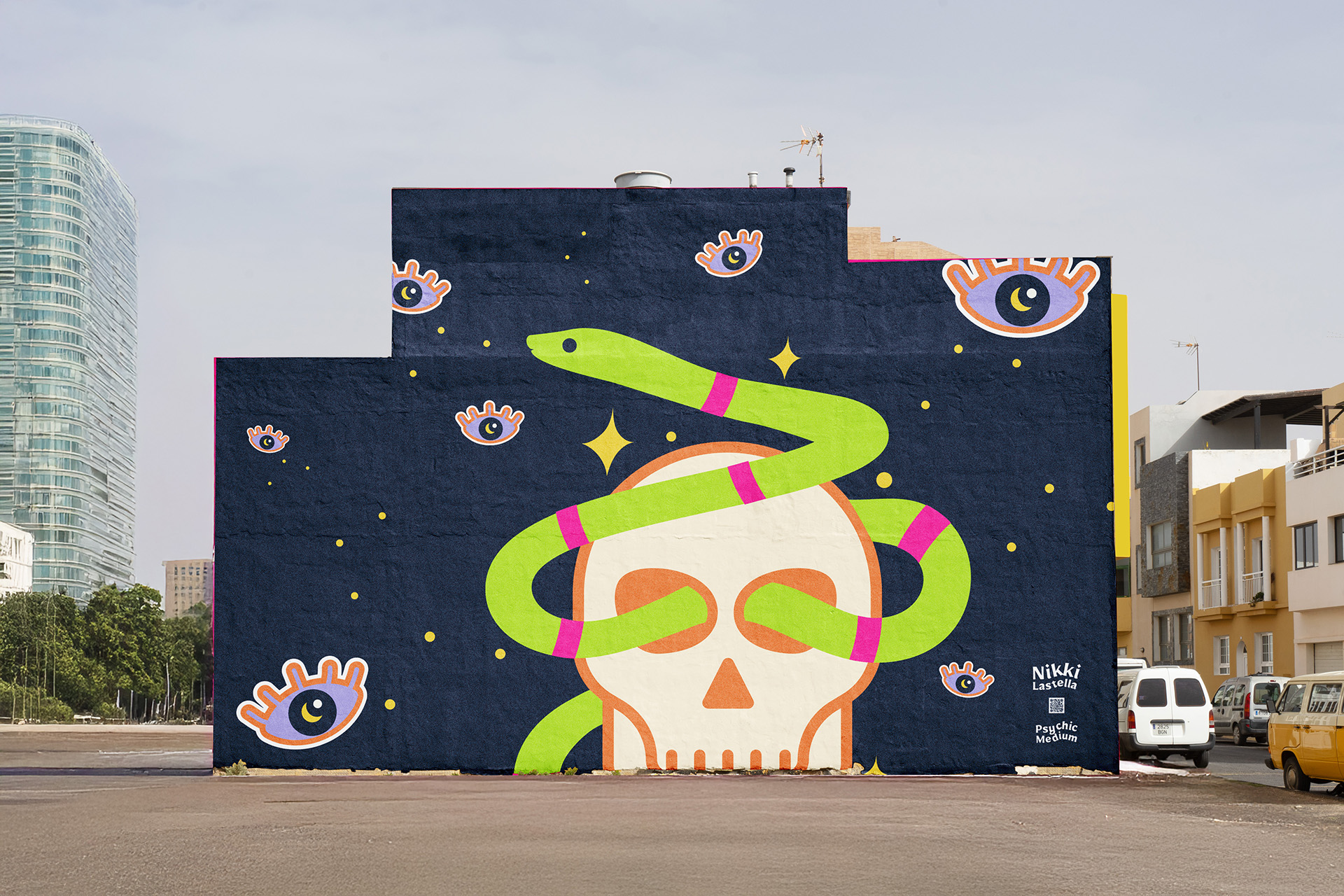 Built a bold psychedelic brand identity. Core visual: stylized skull wrapped in neon-green snake representing transformation and intuition. Electric color palette brought contemporary contrast to a space typically dominated by soft purples and golds. Secondary iconography: all-seeing eye hand, stars, moon phases. The system worked across business cards, storefront signage, building murals, magazine ads, and merchandise.